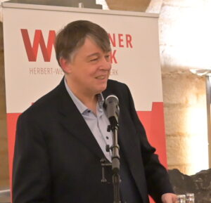 Prof. Dr. Christoph Meyer ist Historiker, hat von 1998 bis 2011 das Herbert-Wehner-Bildungswerk geleitet und war in dieser Zeit gleichzeitig Geschäftsführer des Freundeskreises Herbert-Wehner-Bildungswerk. In dieser Zeit hat er Hans-Jochen Vogel kennengelernt und ihm als Sprecher des Freundeskreises intensiv zugearbeitet. Der Vortragende verband also seine wissenschaftliche Expertise, unter anderem als Biograf von Herbert und Greta Wehner, mit persönlicher Erfahrung zu einem lebendigen Persönlichkeitsbild.
